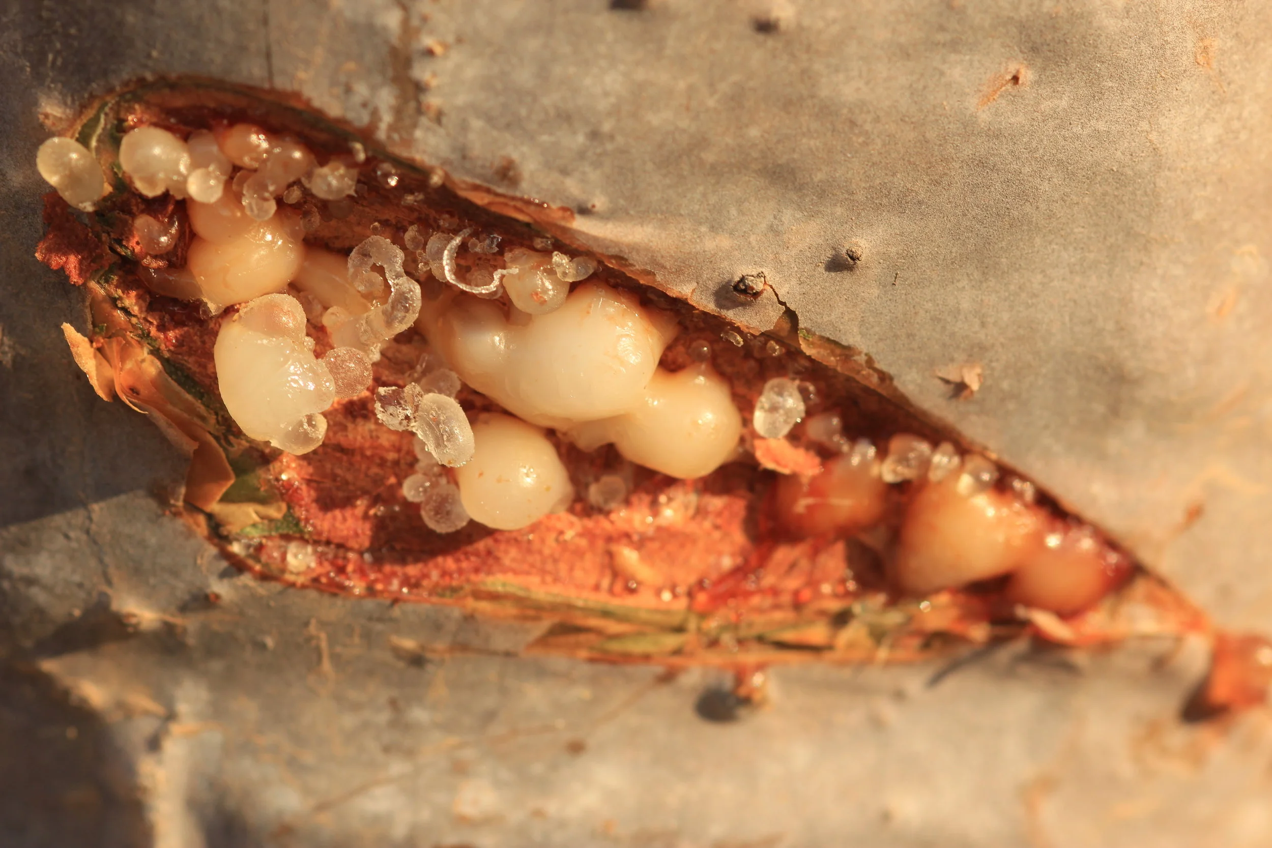 A special tool called a “mengaff” is used to collect frankincense; One end has a sharp edge used for the decortication and the other end being blunt is used in assisting to remove the exudate when it has hardened. In tapping, a wound of 4-8 cm long, 3 cm wide, and 2.5-4 mm depth (ie not through to the wood) is made in one or more places. After about a fortnight, the exudate which collects as globular pear shaped or club shaped tears is removed and the wound freshened. Further collection is carried out every few weeks. At each collection it is customary to remove only the exudate that collects on the wound itself, that which runs down the stem being left to accumulate and collected annually.